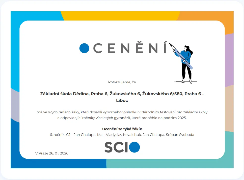 Žáci Základní školy Dědina, Praha 6 – Liboc, dosáhli vynikajících výsledků v Národním testování pro základní školy a odpovídající ročníky víceletých gymnázií, které proběhlo na podzim 2025. V 6. ročníku se umístili mezi nejlepšími v Praze v těchto předmětech: Všem oceněným žákům gratulujeme k mimořádnému úspěchu.