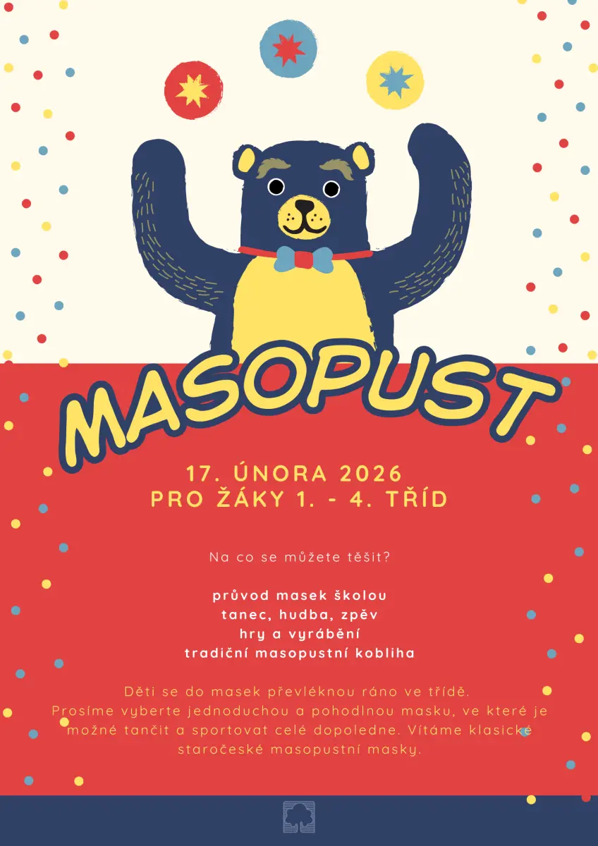 Zveme všechny žáky 1.-4.tříd na dopolední masopustní rej v maskách, nebude chybět ani zpěv, tanec, soutěže a vyrábění. Těšíme se na společně prožitý čas!