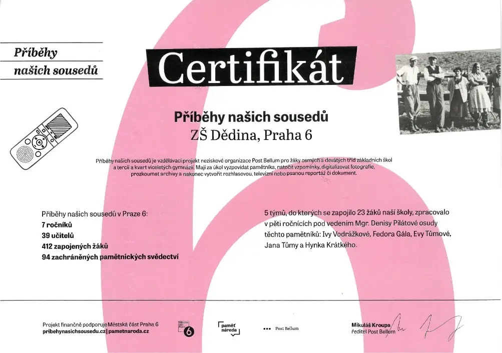 Naše škola se pravidelně účastní vzdělávacího projektu Příběhy našich sousedů a v letošním školním roce tomu nebylo jinak. Žákyně 8. A, Radka Nagovská, Kateřina Vlachová, Ema Začalová a Martina Žáková, pracovaly na projektu víc než tři měsíce. Ve středu 9. 3. se uskutečnily finálové prezentace a děvčata předvedla soustředěný a velmi kultivovaný projev. Všem přítomným představila svou pamětnici, paní Magdalenu Emmerovou, a její zdánlivě obyčejný životní příběh. V konkurenci 12 škol Prahy 6 získal příběh paní Emmerové skvělé 2. místo, a to díky vynikajícímu zpracování, trpělivosti a píli celého žákovského týmu!