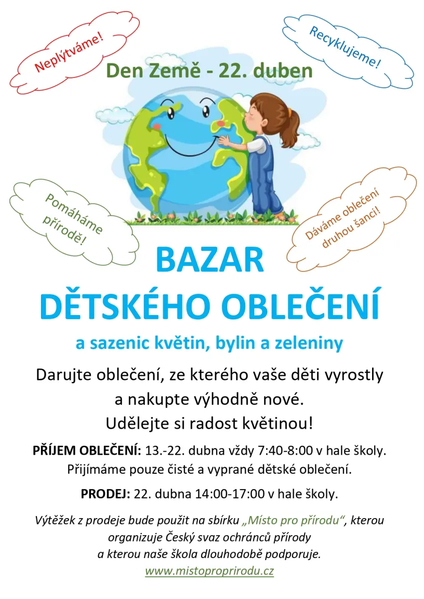 školy letos přibude i bazar dětského oblečení. Bazar je dobročinný. Dětské oblečení, které již