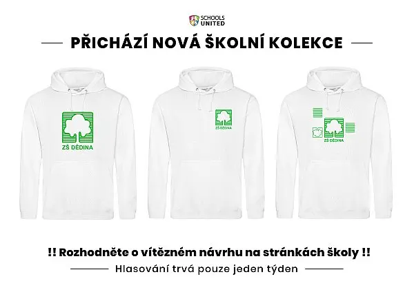 do školy přichází nová školní kolekce oblečení a jste to právě Vy, kdo rozhodne o její podobě! Hlasujte do 26.3.2023 o tom, který ze tří motivů se Vám líbí nejvíce. Vítězný motiv potom použijeme na vytvoření celé kolekce, kde najdete nejen mikiny a trička, ale i tepláky, batohy, čepice a další kousky. Hlasování naleznete zde: https://schoolsunited.cz/hlasovani/5adc1f95