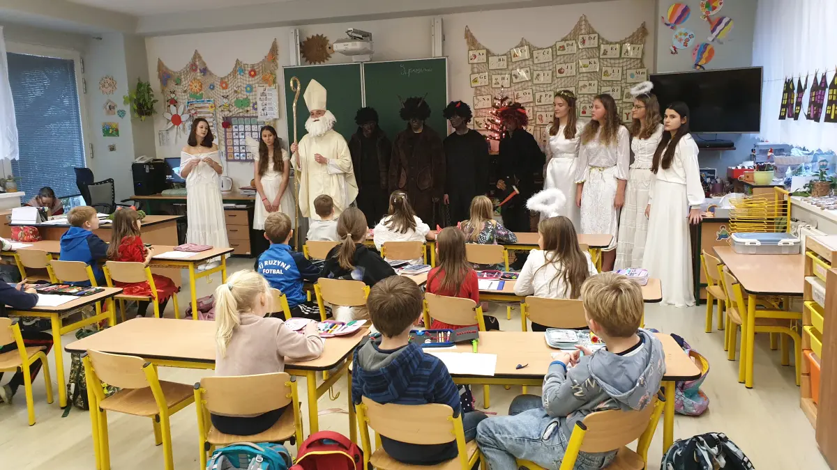 Naše představení vánočních koled u nás ve třídě obdivoval i Mikuláš s čerty a anděly. Mikuláši se to líbilo a tak rozdal dětem zdravé dárky (ovoce).