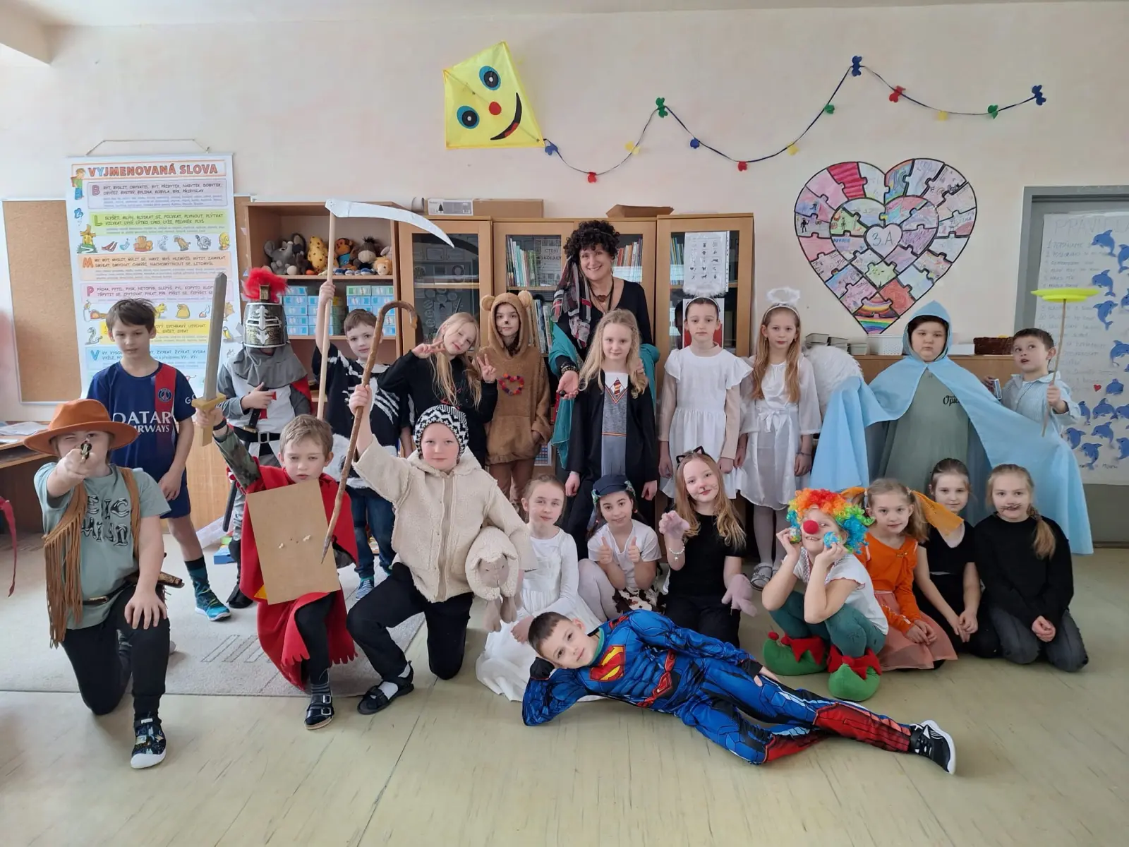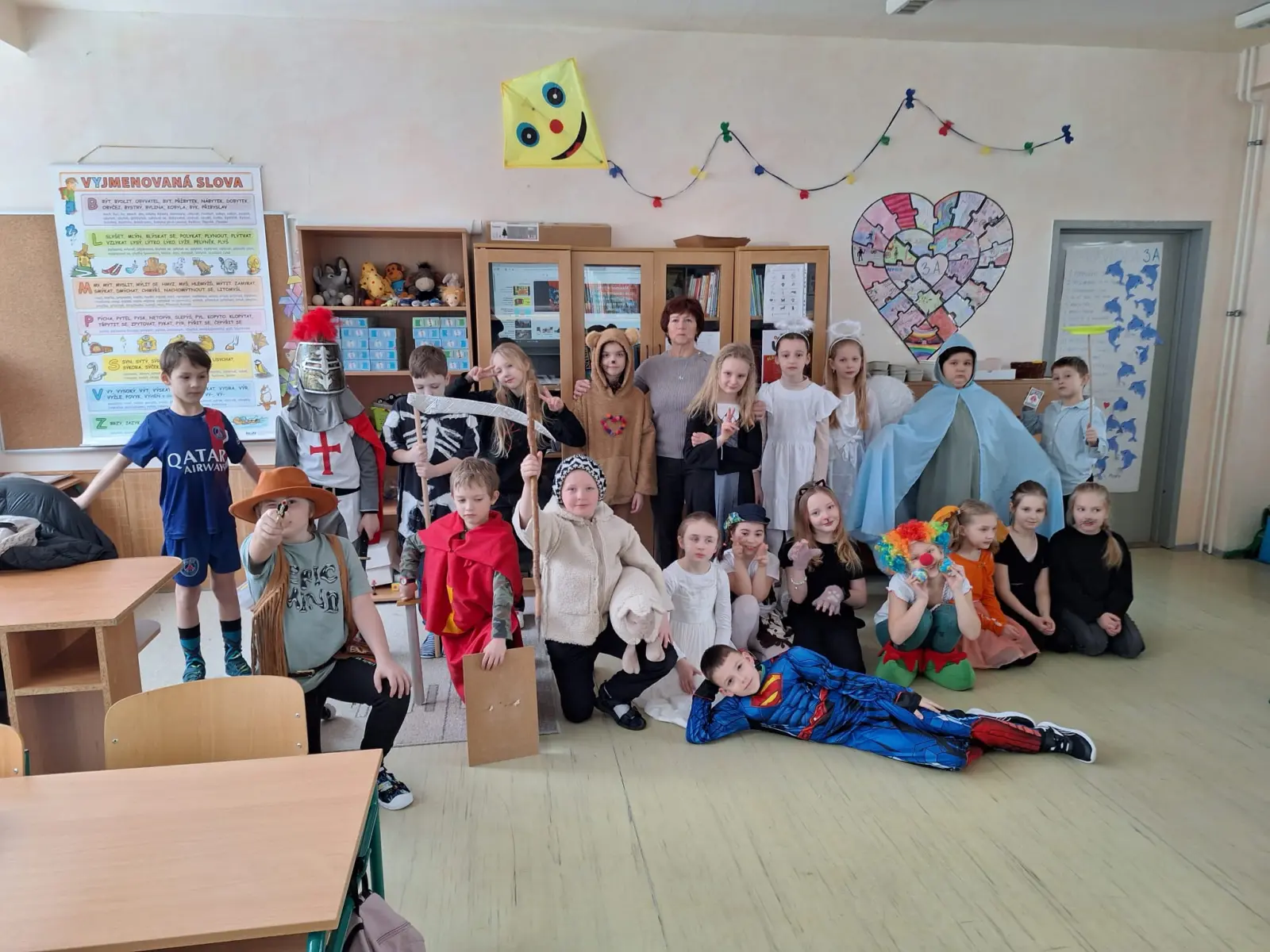 Žáci se převlékli za tradiční masopustní postavy – nechyběli medvědi, kominíci ani další masky – a