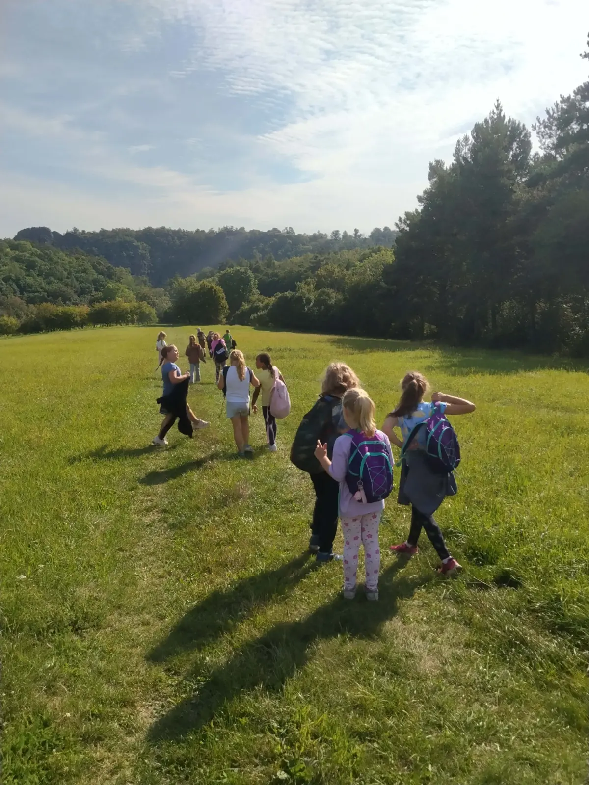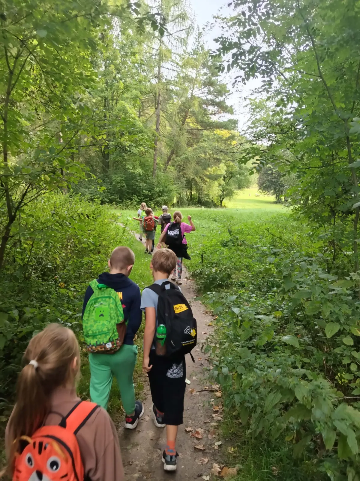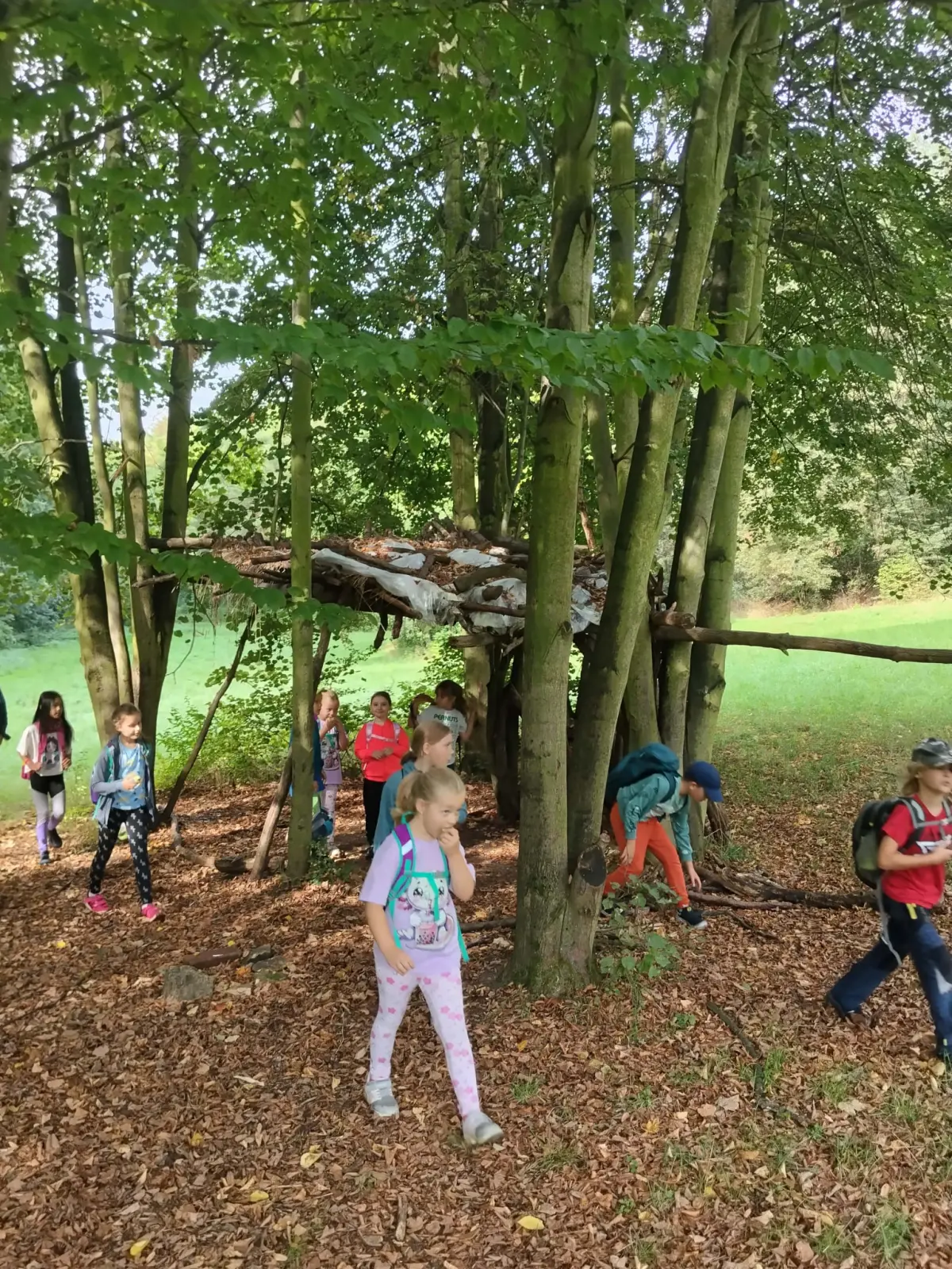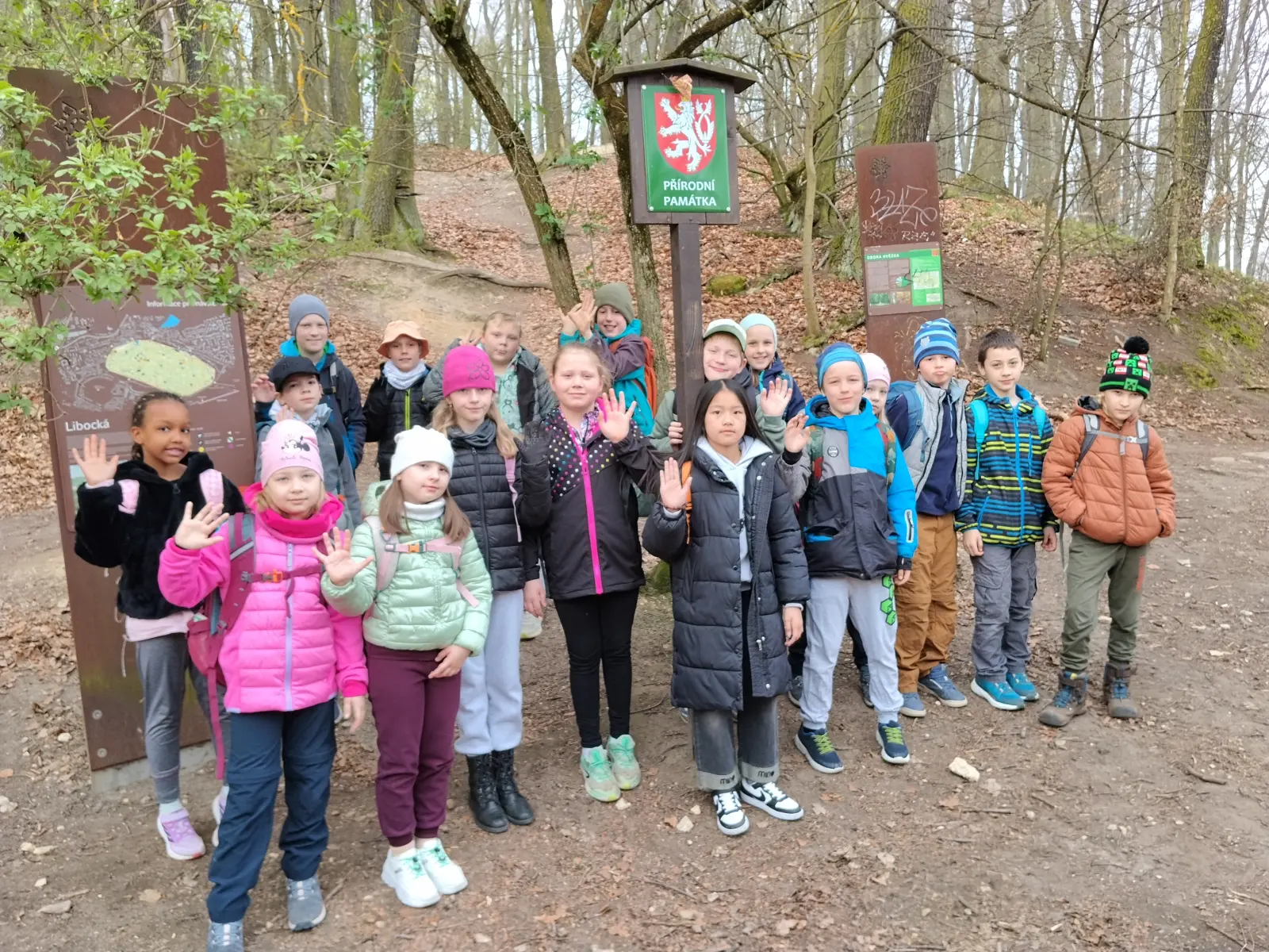 Společně jsme strávili krásný slunečný den v přírodě – vyřádili jsme se na hřišti, prošli se oborou, sjeli kopec po listí, prozkoumali pijavice v Terezce, doběhli autobus a těšili se na oběd.