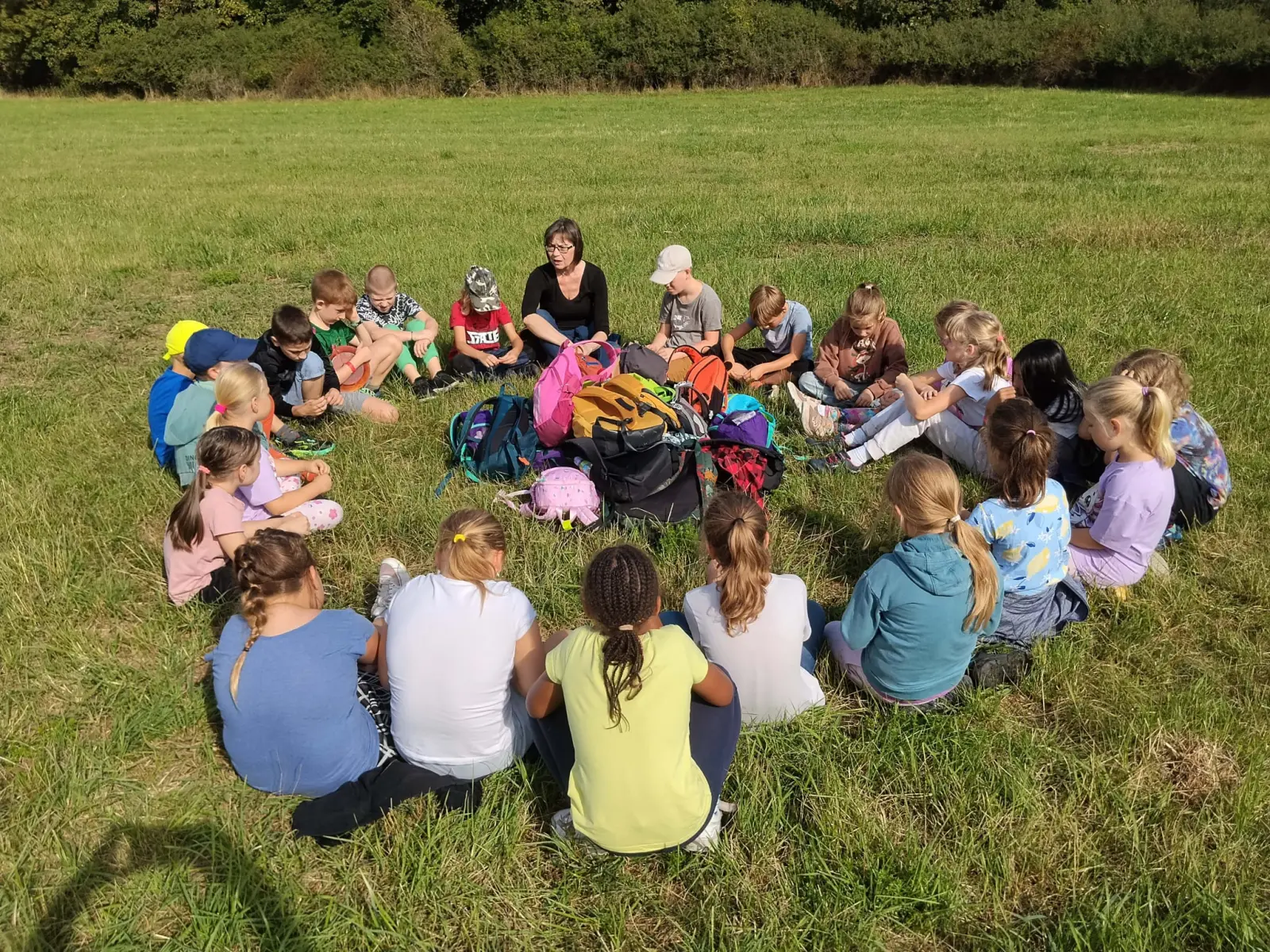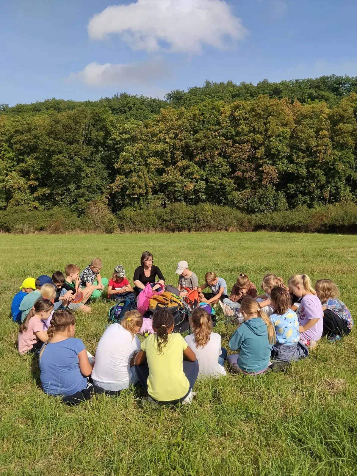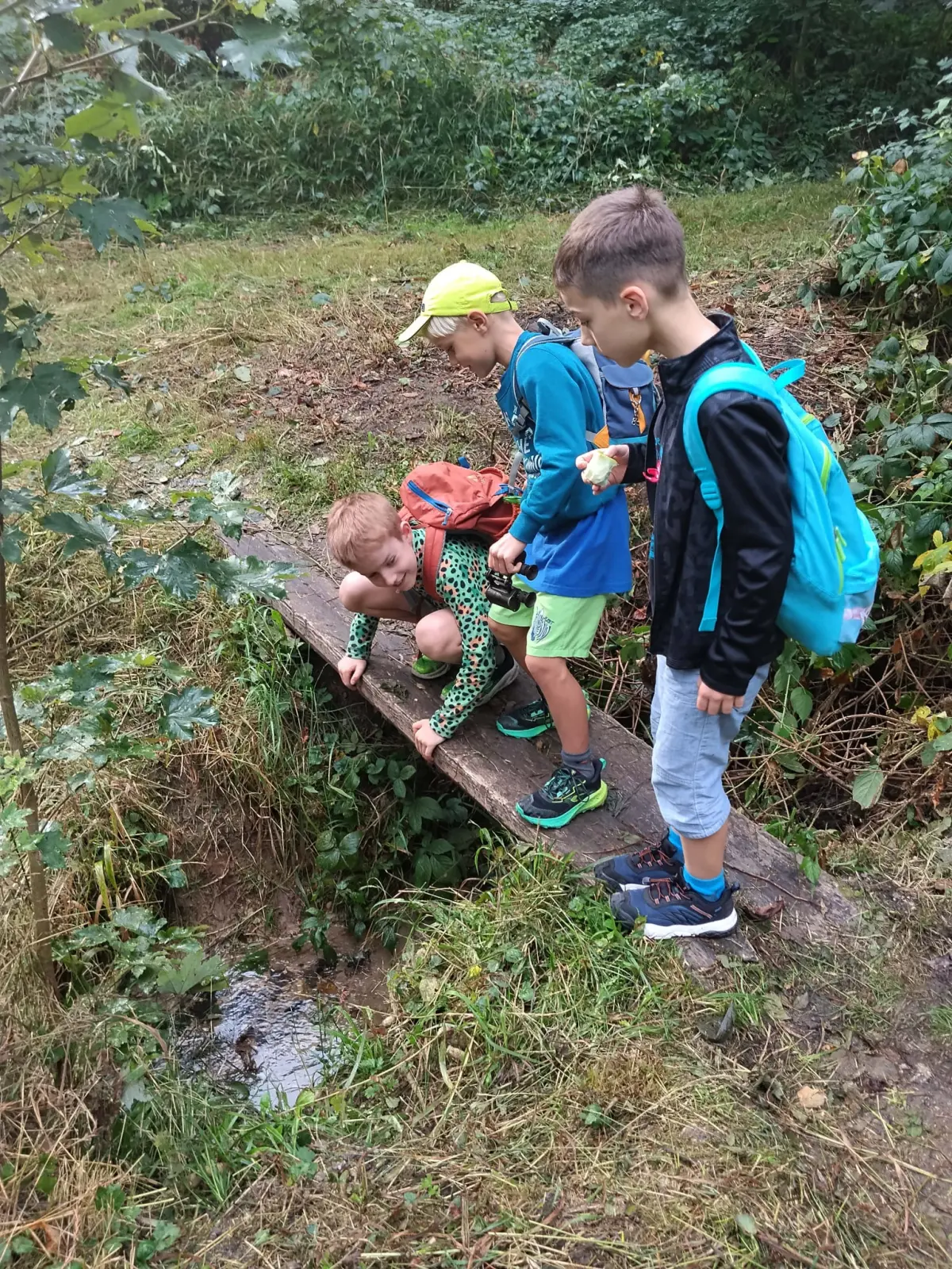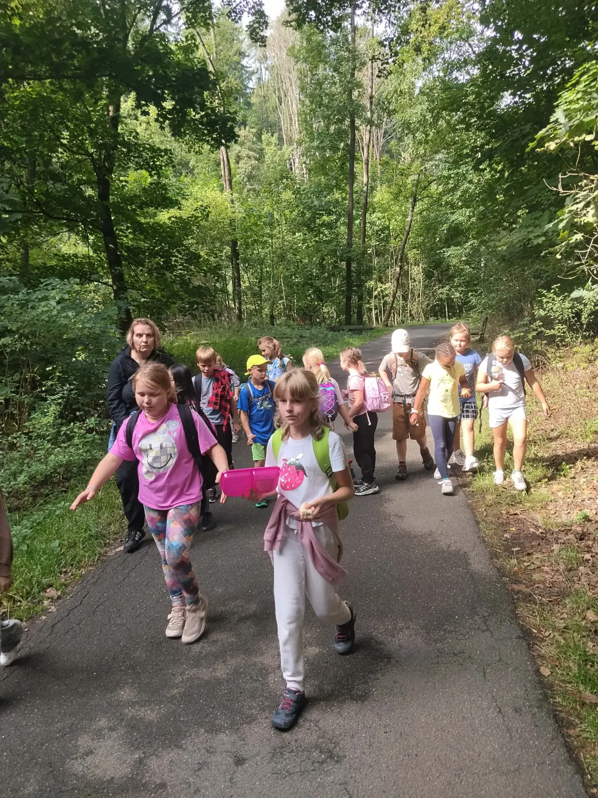 Společně jsme strávili krásný slunečný den v přírodě – vyřádili jsme se na hřišti, prošli se oborou, sjeli kopec po listí, prozkoumali pijavice v Terezce, doběhli autobus a těšili se na oběd.