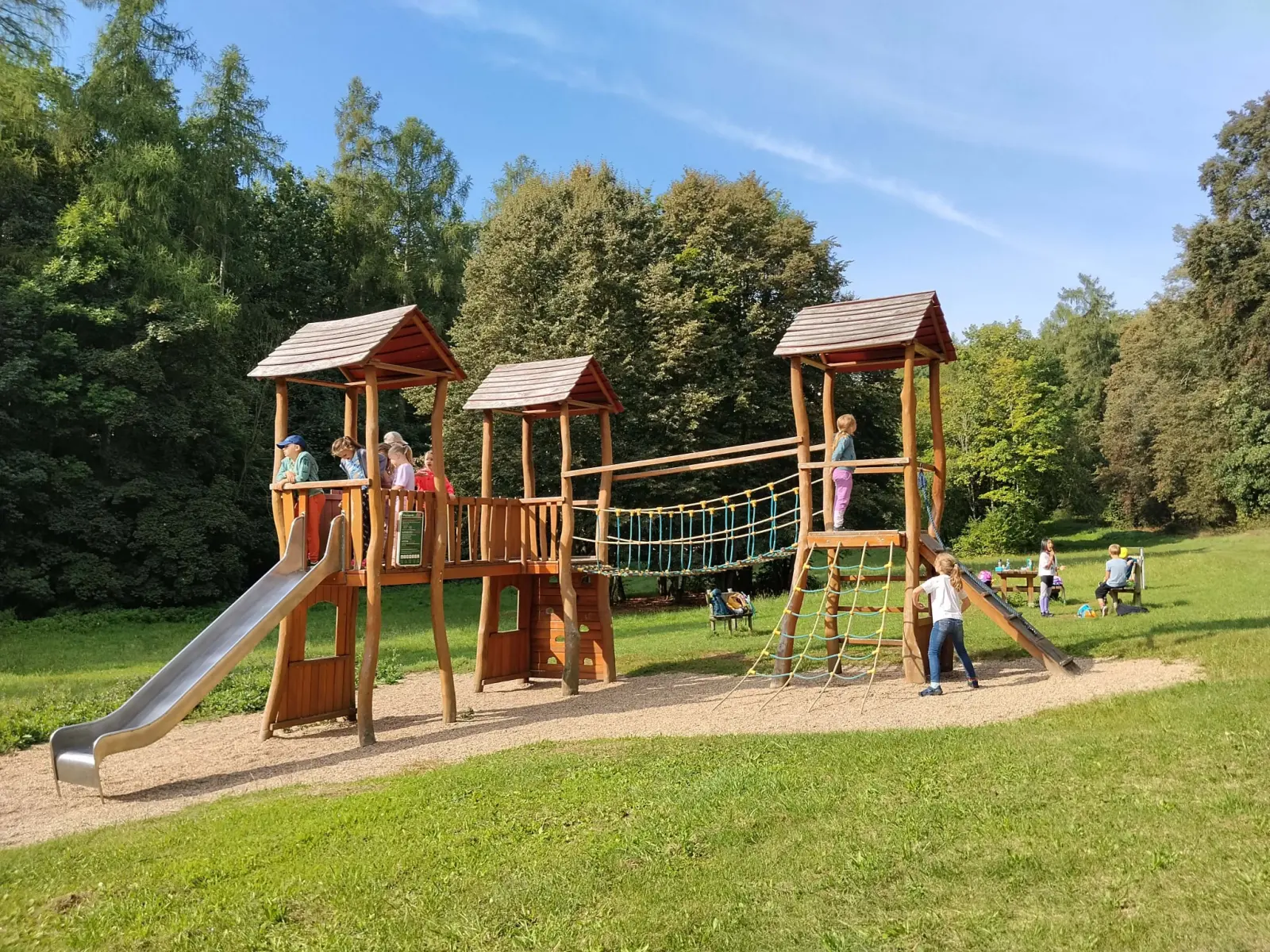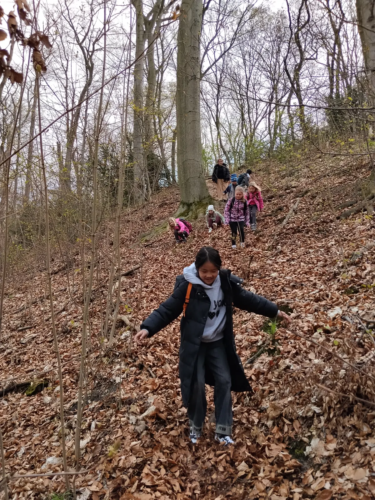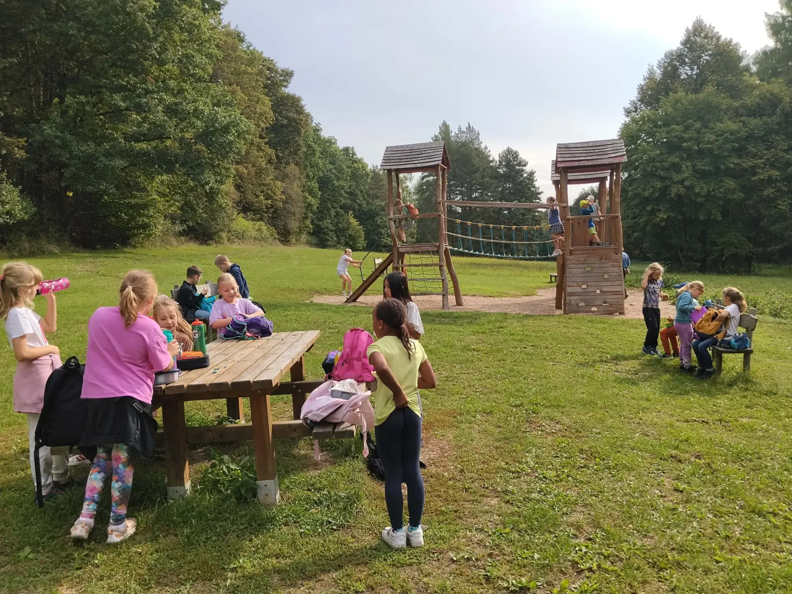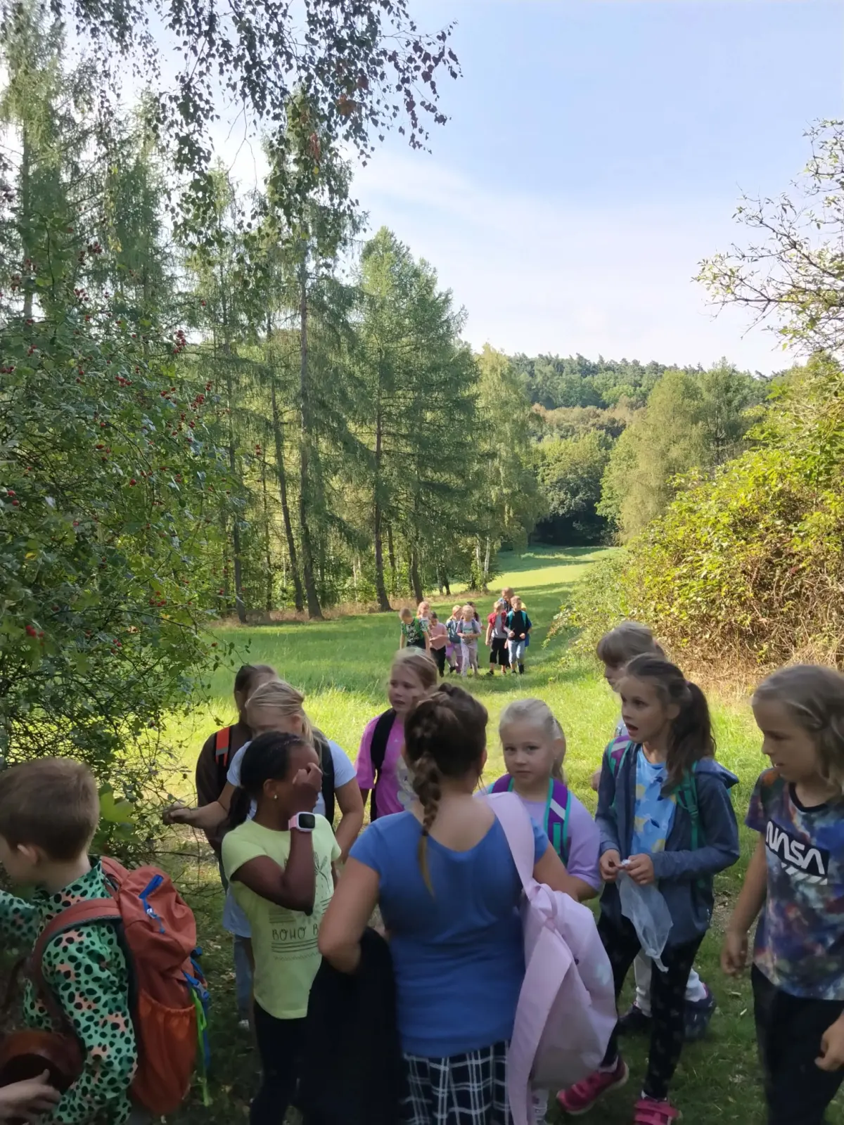 Společně jsme strávili krásný slunečný den v přírodě – vyřádili jsme se na hřišti, prošli se oborou, sjeli kopec po listí, prozkoumali pijavice v Terezce, doběhli autobus a těšili se na oběd.