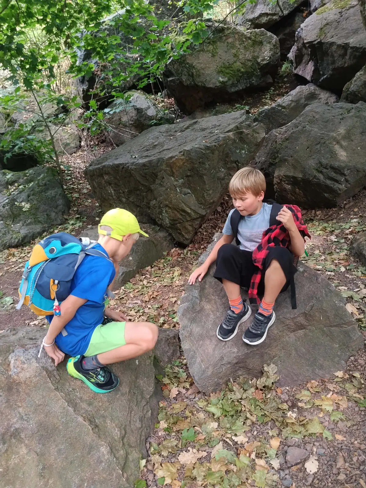 Z deníků: „No už jen 2 dny a jedeme domů. Dnes jsme se vydali do Adršpašských skal. Jeli jsme tam vlakem. Poté, co jsme dojeli, tak jsem si koupil magnetku. Hned co jsem vystoupil, tak jsem uviděl obrovské jezero. Vydali jsme se okolo něj do lesa, kde jsem byl ohromen velikostí krásných skal. Po cestě okolo skal jsme potkali malý potok, ve kterém se třpytili malí pstruzi. Potom jsme prošli puklinou ve skále, kde tekl vodopád. Dál jsme vyšli 2 000 schodů a nahoře na nás čekala loďka, na které jsme se svezli na druhou stranu jezírka. Od loďky jsme se vydali do apartmánu a v apartmánu byla diskotéka. Na strop svítil barevný reproduktor. Po diskotéce byla bojovka, já jsem se vydal sám po svíčkách do cíle, ale cestou jsem spadl z kopce. Ale dostal jsem se nahoru a dorazil do cíle.“ Toník