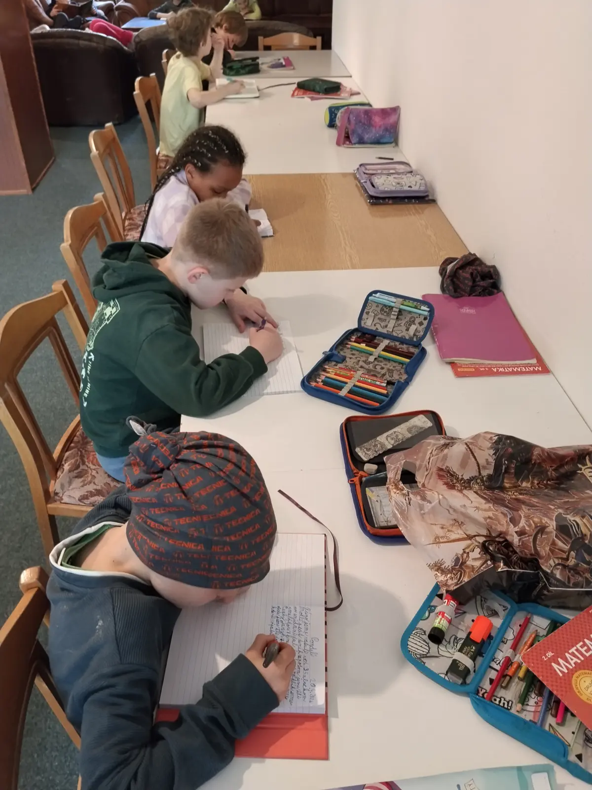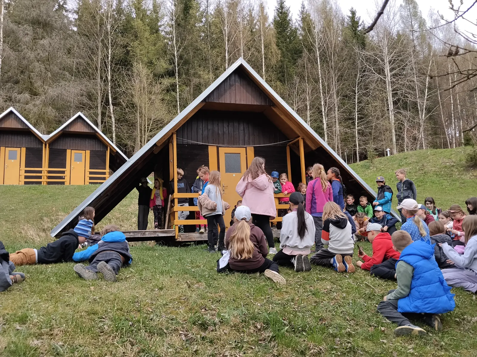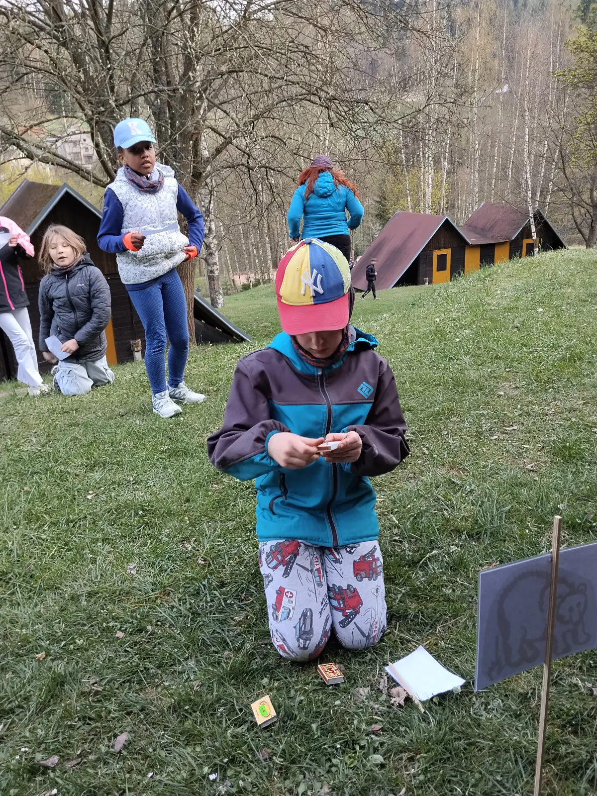 Z deníku: „Probudili jsme se asi v 5.00, protože Matyho budík zvonil. Strašnej šok. Nikdo pořádně nevěděl, co se děje. Pak se Maty vzpamatoval, vstal a budík vypnul. Řekl nám, že by ještě spal. Nějak jsme usnuli. Pro mě další šok – asi Danův budík. Ale proč já?! (Poznámka pro rodiče – budíky vyřešeny). Zase jsem usnul a spal až do šesti ráno. Dvě hodiny jsme si šeptali, až do snídaně … Po snídani jsem se šel podívat na tabuli. A na tabuli stálo: V 9.30 venku, sport. oblečení, před barákem. A upaloval jsem to říct na pokoj. Přemýšleli jsme: Co se asi bude dít? V 9.30 to začalo. Rozdělili jsme se do skupin, poté nám udělili barvy a vysvětlili, co se bude dít. Jako první jsme dostali modrou barvu. A hra byla taková – hledání modrých papírků. Nebyl to žádný zázrak, ale v pohodě, jak v jahodě. Když jsme našli všechny modré papírky s příběhem a přečetli je, tak jsme měli sehrát divadlo. Čekáte: Jaká hlavní role byla tvoje? Žádná, byl jsem kámen. Ano, kámen. Získali jsme 55 bodů, což nám zajistilo 2. místo. Jo, za kámen. První místo patřilo červeným, a to zaslouženě. Dali jsme si svačinu a šli jsme na pokoje. Asi o půl hodiny později jsme vyšli do deště. Došli jsme až na louku, kde nějakým zázrakem byl sníh, sice jen malý plácek, ale cože? Věřte mi. Po obědě další aktivita a tentokrát vevnitř. Než začaly hry, panoval chaos. Tady je vysvětlení – jedná se o 6disciplínovou hru: Hra 1. ping-pong, hra 2. Ořezávání tužek, hra 3. kostky (náhodné), hra 4. karty (žolík), hra 5. kelímky na čas, hra 6. skládání obrazců. Potom byla večeře, čtení a spát.“ Jáchym