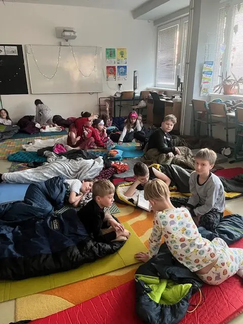 Po hrách a čtení vlastních knížek přišel čas 🕤 na zlatý hřeb večera – spaní ve škole! 😴 🤫 🌜 ❤ Byl to pro všechny zážitek a těšíme se na další ročník! 🥰 🤗