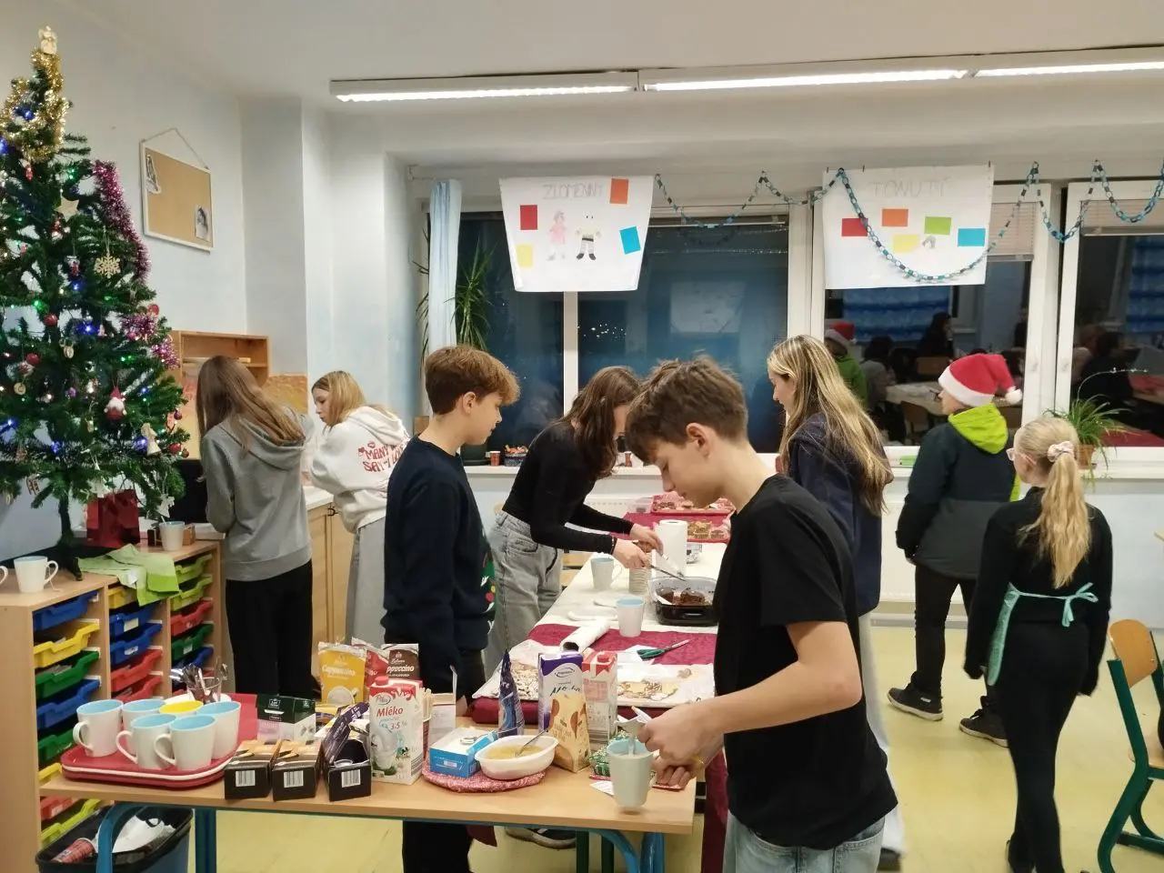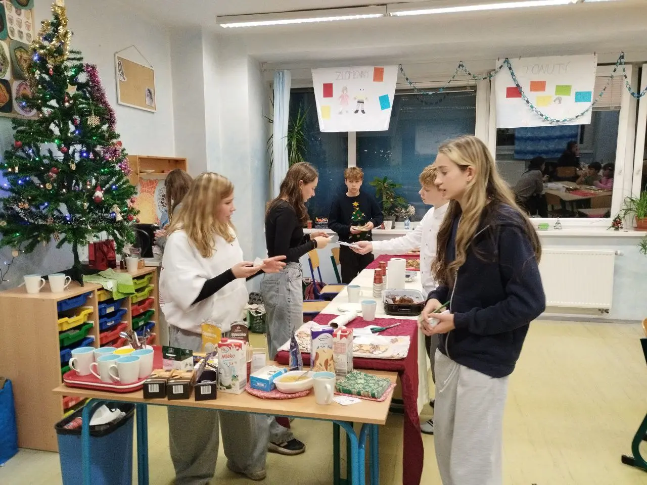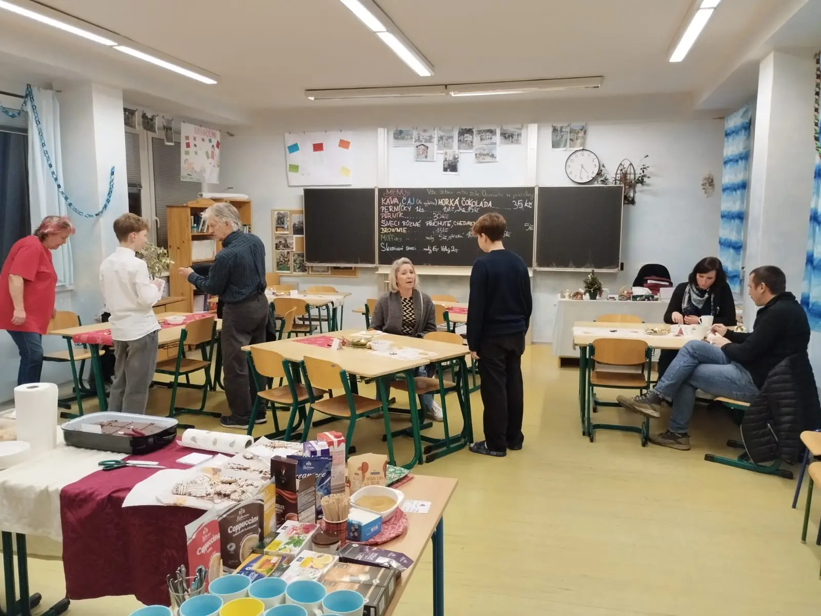 Nicméně 10. prosince se konala celoškolní předvánoční slavnost, na níž se žáci 7.A rozhodli opět uspořádat ve své kmenové třídě kavárnu. Pro tuto příležitost jsme i v hodině anglického jazyka, kde jsme se skupinou jazykářů zrovna probírali vaření a pečení, navštívili školní kuchyňku a napekli do naší kavárničky nějaké muffiny. Zvláště Áďa, Bára, Martin, obě Elišky, Sofi, ale i další se zcela zásadním způsobem zasadili o skvělou organizaci.