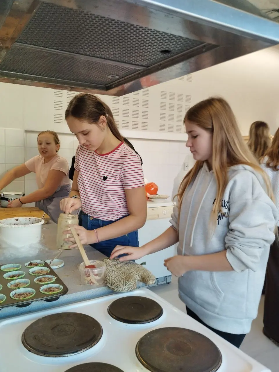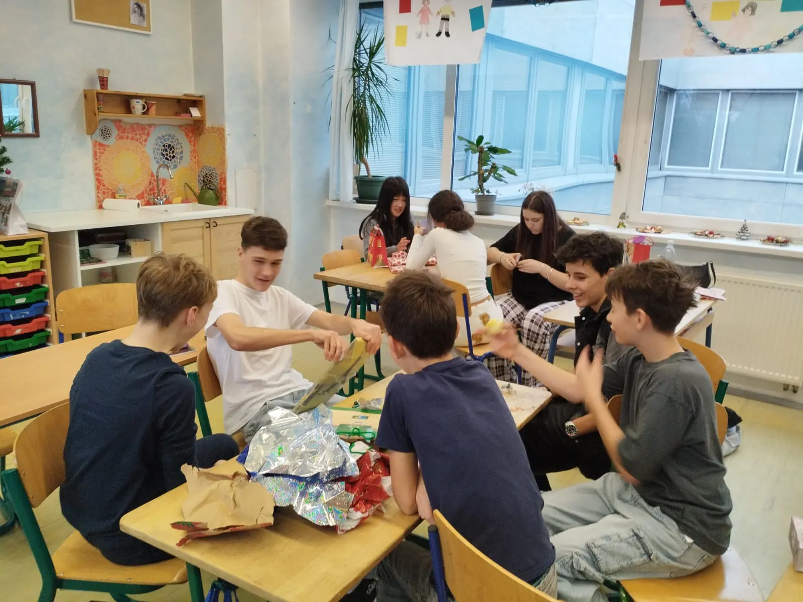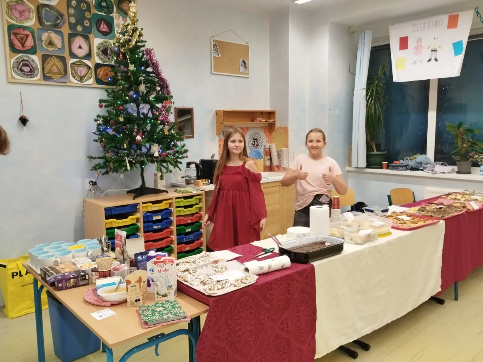 Nicméně 10. prosince se konala celoškolní předvánoční slavnost, na níž se žáci 7.A rozhodli opět uspořádat ve své kmenové třídě kavárnu. Pro tuto příležitost jsme i v hodině anglického jazyka, kde jsme se skupinou jazykářů zrovna probírali vaření a pečení, navštívili školní kuchyňku a napekli do naší kavárničky nějaké muffiny. Zvláště Áďa, Bára, Martin, obě Elišky, Sofi, ale i další se zcela zásadním způsobem zasadili o skvělou organizaci.