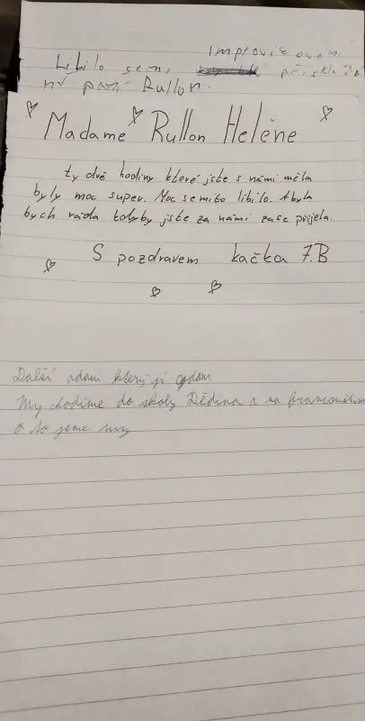 Paní Rullon si získala pozornost a sympatie našich žáků svou osobností, nadšením a svým netradičním přístupem k výuce. O tom svědčí dopisy, které jí žáci napsali. Její přínos k obohacení vzdělávacího prostředí na Základní škole Dědina byl oceněn jak učiteli, tak žáky.