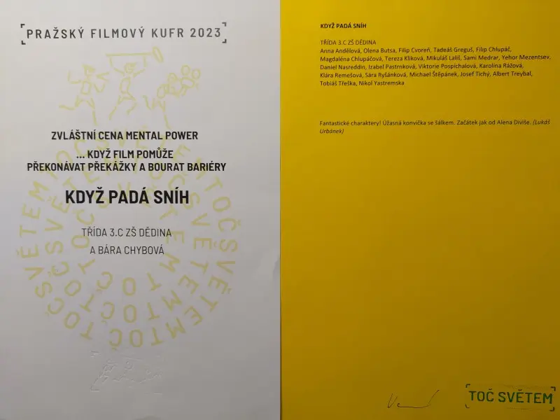 Žákyně a žáci 3.C se 11. listopadu 2023 zúčastnili festivalu Pražský filmový kufr v La Fabrice. Prezentovali zde svůj krátký animovaný film Když padá sníh, který vyrobili metodou ploškové animace. Na přípravě filmu pracovali před rokem po dobu několika týdnů a odměnou jim byla radost z výtvarné práce, posléze z projekce filmu rodičům, a nyní po roce i ocenění od odborné poroty festivalu. Třeťáci zde získali cenu v tematické sekci Mental Power, účastnili se dílen a projekcí a popovídali si s ilustrátorem a porotcem soutěže Lukášem Urbánkem.
