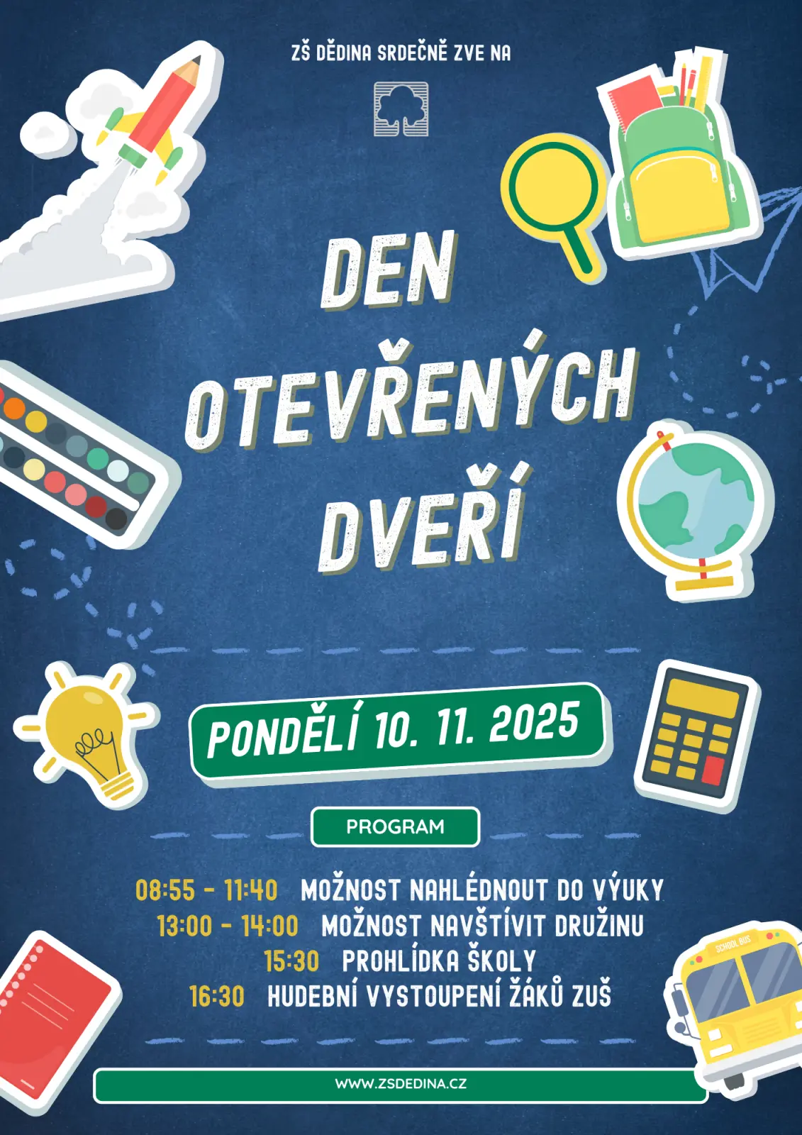 dovolujeme si Vás pozvat na Den otevřených dveří na ZŠ Dědina, který se bude konat 10.11. 2025. Program naleznete v přiloženém plakátku.
